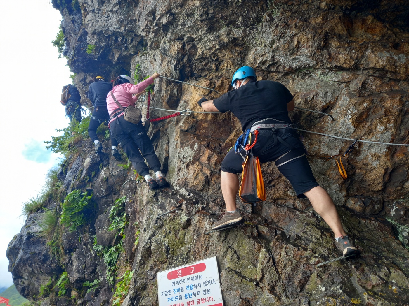 용대리 매바위 수직 100m. 사이클과 트레일을 끝낸 다리로 암벽을 오른다. 지상 경험을 따지지 않는다 — 장비와 기술 모두 현장에서 제공된다.